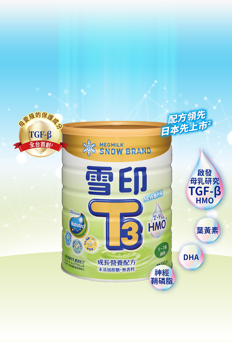 1. .根據2024/1~2025/7市售成長配方罐上標示 2.指TGF-β在日本雪印配方產品